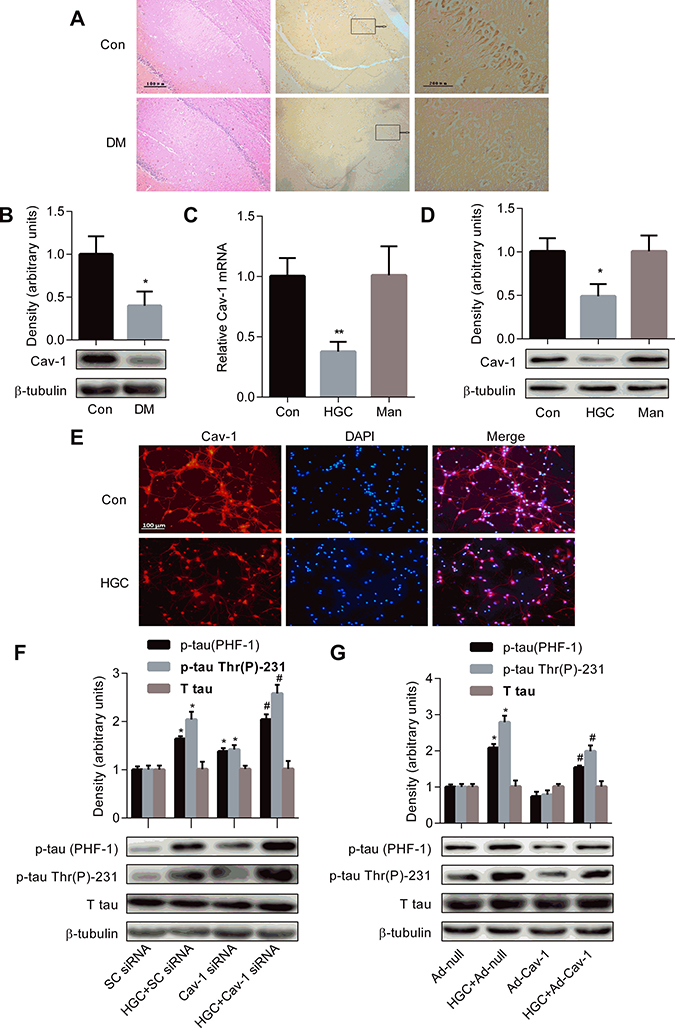 Figure 3: Decreased Cav-1 expression contributes to the formation of tau hyperphosphorylation under hyperglycemic condition. (A) Representative pictures from paraffin-embedded sections of control and diabetic rats immunostained with antibody to Cav-1. (B) Western blot showed the expression level of Cav-1 in the hippocampi of control and diabetic rats brains. Real time PCR (C) and Western blot (D) showed the expression level of Cav-1 in cultured hippocampal neurons exposed to 25 mM glucose (Con), 50 mM glucose (HGC) or 25 mM mannitol (Man). *p < 0.05, **p < 0.01 vs Con. (E) Immunofluorescence staining was used to detect the expression of Cav-1 in hippocampal neurons. Cav-1 was shown in red. (F) Knockdown of Cav-1 aggravates tau hyperphosphorylation after HGC. *p < 0.05 vs SC-siRNA; #p < 0.05 vs HGC+SC-siRNA. (G) Over-expression of Cav-1 ameliorates HGC-induced tau hyperphosphorylation. *p < 0.05 vs Ad-null; #p < 0.05 vs HGC + Ad-null. Error bars represent s.e.m.
