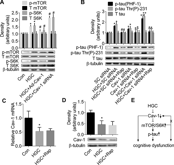 Figure 4: mTOR/S6K signalling is required for formation of Cav-1-regulated tau hyperphosphorylation. (A) Cav-1-induced counteraction of HGC is associated with mTOR/p70S6K signalling in hippocampal neurons. *p < 0.05 vs Con; #p < 0.05 vs HGC. (B) mTOR/p70S6K signalling is required for HGC and/or Cav-1 knockdown-induced tau hyperphosphorylation. *p < 0.05 vs SC-siRNA; #p < 0.05 vs HGC + SC-siRNA; $p < 0.05 vs Cav-1 siRNA; &p < 0.05 vs HGC + Cav-1 siRNA. (C–D) The mRNA and protein expressions of Cav-1 were not regulated by mTOR signalling in hipocampal neurons. *p < 0.05 vs Con. (E) a summary of the roles of Cav-1-mTOR/S6K signalling and tau hyperphosphorylation in DM-mediated cognitive dysfunction. Error bars represent s.e.m.