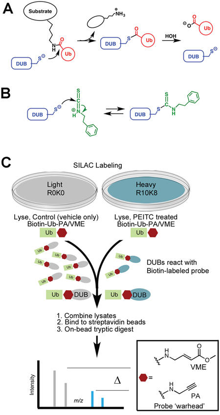 Figure 1: Reaction of PEITC with DUBs. (A) Mechanism of substrate hydrolysis. (B) Proposed mechanism of PEITC inhibition. (C) SILAC-assisted quantitative proteomics strategy to identify DUBs inhibited by PEITC.