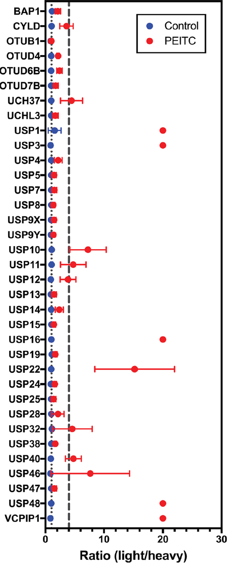 Figure 2: DUB targets of ITCs in HeLa cell lysates identified using SILAC-assisted quantitative MS. Data presented are the mean ± standard deviation of samples from two independent biological replicates. DUBs are listed only if they appeared in both biological replicates (n = 2). The gray dotted line marks a light:heavy ratio of 1. The gray dashed line marks the threshold light:heavy ratio = 4. Peptides that are only detected in the light sample are designated an arbitrary ratio value of 20. In several samples, error bars are smaller than the symbol.