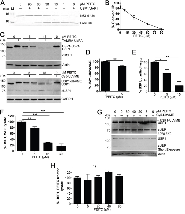 Figure 3: PEITC inhibits recombinant USP1 and leads to USP1 knockdown in living cells. (A) USP1/UAF1 complex (150 nM) was pre-incubated with PEITC or with DMSO control for 8 min at which time K63-linked di-ubiquitin was added (3 μM) and incubated for 10 min at 37°C. Experiments were quenched by the addition of reducing loading buffer. Samples were analyzed by SDS-PAGE (15% gel) and the gels stained with InstantBlue (Expedeon). Data are representative of three independent experiments. (B) As in (A) the amount of cleaved (free) ubiquitin was measured and data were normalized to the no inhibitor control. (C) HEK293T cells were incubated with PEITC for 3 h, harvested, washed and lysed with glass beads. Clarified lysates adjusted to 1.6 mg/mL and treated with TAMRA-Ub-PA (1.2 μM, top) or with Cy5-Ub-VME (1.2 μM, bottom) for 8 min at 25°C and analyzed by SDS-PAGE and western blot. ‘cUSP1’ is cleaved USP1. Actin and GAPDH are shown as loading controls. (D) Clarified lysates were prepared as in (C) and treated with TAMRA-Ub-PA (1.2 μM) or with Cy5-Ub-VME (1.2 μM) for 8 min at 25°C. % USP1-Ub-PA/VME was determined (densitometry) by calculating the ratio of the top, USP1-probe conjugated band to total USP1 levels. Data were normalized to the DMSO (vehicle only) control. Data represent mean ± SD of 4 independent experiments. Representative blots shown in (C). (E) As in (C), total USP1 levels were determined by normalizing the sum of both USP1 bands to actin (or to GAPDH) and DMSO control. Data represent mean ± SD of 4 independent experiments. (F) HEK293T cells were incubated with PEITC for 3 h and WCLs were analyzed by SDS-PAGE and western blot. Total USP1 levels were determined by normalizing the USP1 band to the loading control (actin or GAPDH) and to DMSO control. Data represent mean ± range of at least two independent experiments. See Supplementary Figure 3A for representative blot. (G) A HeLa cell lysate (1.5 mg/mL) was incubated with PEITC or with DMSO (vehicle only) for 25 min at 37°C at which time Cy5-Ub-VME (1.2 μM) was added. Following a 30 min probe incubation, aliquots (equal volumes) were analyzed by immunoblotting for USP1. Actin is shown as a loading control. (H) As in (G) Total USP1 levels normalized to actin and are relative to the no inhibitor control. Data represent mean ± SD of 2 independent experiments. Representative blot shown in (G) ‘ns’ equals not significant. P < 0.05 *; P < 0.01 **; P < 0.001 ***