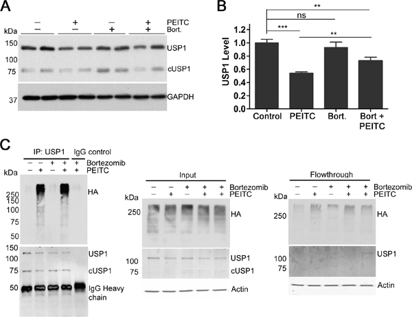 To investigate whether the PEITC-induced knockdown of USP1 was due to proteasomal degradation, HEK293T cells were incubated with PEITC in the presence of the proteasome inhibitor bortezomib (Figure 4A). Bortezomib increased total K48-linked ubiquitination as expected but had no effect on USP1 levels (Figure 4A, 4B and Supplementary Figure 3B). However, when cells were treated with PEITC in the presence of bortezomib, a significant increase in USP1 was detected when compared with PEITC treatment alone (Figure 4A, 4B and Supplementary Figure 3B). We next determined if PEITC treatment increased levels of polyubiquitinated USP1. To facilitate visualization of USP1 ubiquitination, HEK293T cells were transiently transfected with HA-tagged ubiquitin prior to treatment with PEITC, bortezomib or a combination of PEITC and bortezomib. USP1 immunoprecipitated from PEITC or PEITC/bortezomib treated lysates showed a significant amount of poly-ubiquitination (Figure 4C and Supplementary Figure 3C). In contrast, USP1 from the bortezomib or DMSO control lysates contained low or undetectable, levels of polyubiquitination. PEITC does not increase expression levels of 20S proteasomal subunits β1 or α3 (Supplementary Figure 3D, 3E), which suggests that 26S proteasome levels remain stable upon PEITC treatment. Thus PEITC induces the proteasomal degradation of USP1 by increasing the poly-ubiquitination of USP1.