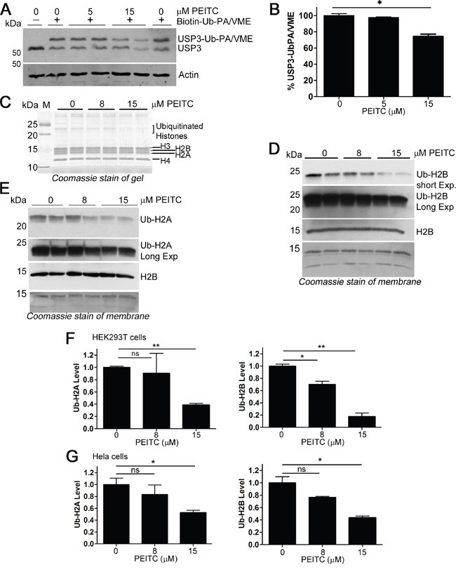 Figure 6: PEITC inhibits histone H2A and H2B deubiquitinases, yet reduces levels of ubiquitinated H2A and H2B. (A) HEK293T cells were incubated with PEITC for 3 h, harvested, washed and lysed with glass beads. Clarified lysates adjusted to 1.6 mg/mL and treated with Biotin-Ub-PA/VME (1.2 μM, an equal mix of both probes) for 8 min at 25°C and analyzed by SDS-PAGE and western blot. Actin shown as loading control. (B) Clarified lysates were prepared as in (A) and % USP3-Ub-PA/VME was determined (densitometry) by calculating the ratio of the top, USP3-probe conjugated band to total USP3 levels. Data were normalized to the DMSO (vehicle only) control. Data represent mean ± SD of 2 independent experiments. Representative blot shown in (A) (C-E) HEK293T cells were incubated with PEITC or with DMSO (vehicle only) for 3 h. Cells were harvested and subjected to standard histone extraction protocol. (C) An equal volume of histone extract from each experiment was resolved on a 14% polyacrylamide gel and stained with InstantBlue (Expedeon). (D) and (E) Histone extracts (equal protein load for each lane) were analyzed by SDS-PAGE and immunoblotted with anti-ubiquityl-H2A, anti-ubiquityl-H2B, or with anti-H2B. Data are representative of two independent experiments. Coomassie stain of membrane shown to demonstrate loading. (F) Quantification (densitometry) of blots shown in (D) and (E), Ub-H2A and Ub-H2B protein levels were normalized to total histone levels (from Coomassie stained membrane). Data represent mean ± range of two independent experiments. (G) HeLa cells were incubated with PEITC or with DMSO (vehicle only) for 3h. Cells were harvested and subjected to standard histone extraction protocol. Ub-H2A and Ub-H2B protein levels were normalized to total histone levels (from Coomassie or Ponceau S stained membrane). Data represent mean ± SD of two independent experiments. Representative blots and stains shown in Supplementary Figure 5. ‘ns’ equals not significant. p < 0.05 *; p < 0.01 **; p < 0.001 ***.