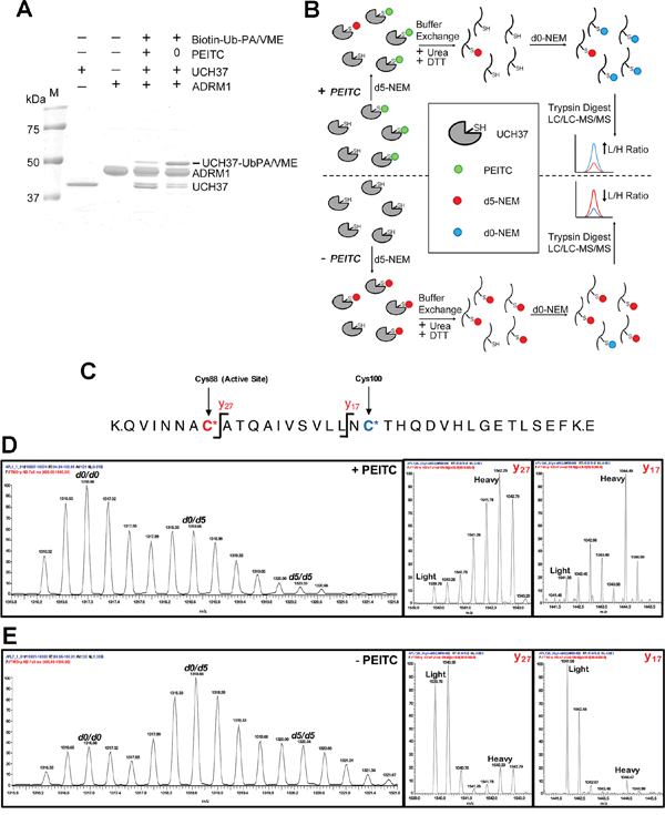 Figure 7: PEITC targets the catalystic cysteine in UCH37. (A) rUCH37/ADRM1 complex (1:1.3 molar ratio) was incubated with 1.5 mM PEITC for 15 min at 25°C and then treated with Biotin-Ub-PA/VME (an equal mix of both probes) for 5 min at 25°C. Coomassie stain of gel depicted. (B) Strategy for identifying PEITC labeled UCH37 cysteines. Samples (+/- PEITC) are initially treated with deuterated N-ethylmaleimide (d5-NEM), then denatured in the presence of dithiothreitol (DTT) to reverse the PEITC modification. Samples are then treated with unlabeled d0-NEM to label newly exposed cysteines and subjected to trypsin digestion. The resulting peptide samples are analyzed by LC-MS/MS. Peptides containing cysteine residues that were modified by PEITC will have a higher ratio of d0-NEM/d5-NEM labeled peptides compared to cysteine residues that did not form a PEITC adduct. (C) Schematic of the tryptic peptide containing the UCH37 active site cysteine residue. The active site cysteine (Cys88) is highlighted in red, while the second non-active site cysteine (Cys100) is highlighted in blue. The y17 and y27 ions fragmentation sites are also indicated. (D) MS1 and MS2 analysis of the C88/C100 tryptic peptide from the PEITC treated sample. Averaged d0/d0, d0/d5, and d5/d5 isotopic envelopes are displayed as well as the y17 and y27 fragmentation ions for the d0/d5 parent ion. (E) MS1 and MS2 analysis of the Cys88/Cys100 tryptic peptide from the untreated sample. Averaged d0/d0, d0/d5, and d5/d5 isotopic envelopes are displayed as well as the y17 and y27 fragmentation ions for the d0/d5 parent ion.