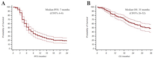 Figure 1: Kaplan-Meyer plot for Progression Free Survival (A) and Overall Survival (B).