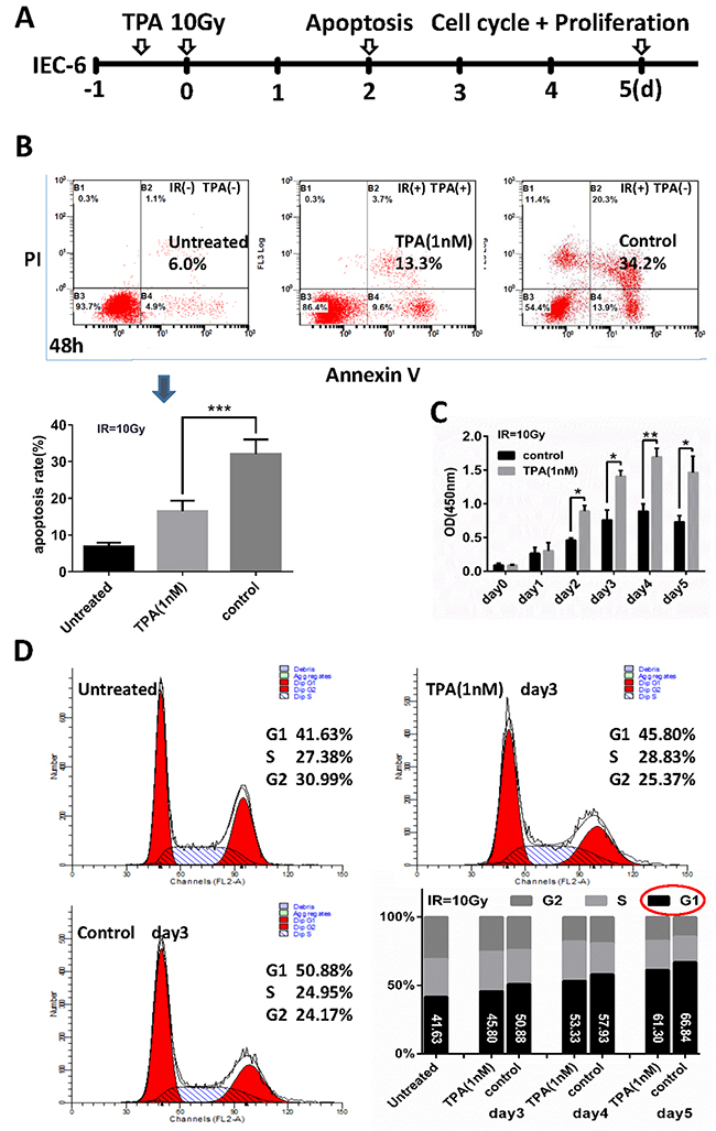 The vitro experimental design is schematically presented in Figure 1A. To delineate its role in cell survival, we evaluated whether TPA altered apoptosis following γ-IR exposure. We treated IEC-6 cells with 1nM TPA for 12h before radiation, cells were doubly-stained with propidium iodide and annexin V–FITC, and analyzed them by flow cytometry. At 48 hours, cells in the TPA-treated group had a lower apoptosis rate (16.53% ± 1.41%) than did control group cells (32.05% ± 2.00%), although the apoptosis rates under these two conditions are higher than the untreated cells (6.80% ±0.80%) as shown in Figure 1B. We also treated IEC-6 cells with 1nM TPA for 12h before irradiation, stained them with cell counting kit-8 to assess their proliferation. The proliferation of the TPA-treated IEC-6 cells was gradually increased in the initial 4 days. Meanwhile, the proliferation of the control non-TPA treated IEC-6 cells was also increased, but at a lower rate than the TPA-treated group as shown in Figure 1C. In addition, the flow cytometric analysis, revealed that radiation induced cell cycle arrest at G1 phase while TPA promoted the transition from G1 to S phase of the cell cycle. These findings suggested a significant proliferative effect of TPA on cell cycle progression following radiation exposure (Figure 1D).
