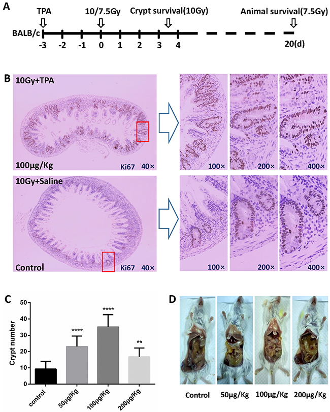Figure 2: Effects of TPA on crypt survival after radiation exposure. (A) Schematic representation of the vivo experimental design. BALB/c mice were treated with Saline or TPA via tail vein for 3 days prior to 10Gy TBI (n = 3 in each group) and were euthanized at 3.5 days after the IR for crypt survival assays. Another set of mice were subjected to overall animal survival studies for up to 20 days post-IR, and times of death were noted. (B) BALB/c mice in the control group or the TPA-treated group were subjected to TBI (n = 3 in each group). These mice were euthanized 3.5 days post-IR. The small intestines were harvested, fixed, and processed. The presence of more than five Ki67 positive cells grouped together was recorded as surviving crypts. Representative images (40×magnification) of intact small intestine crypts harvested at 3.5 days post-IR from mice treated with either saline or TPA. (C) Average number of surviving crypts per cross section was counted and presented. The values in the bar graph are given as average ± SEM and denote statistically significant differences (P<0.0001) compared to control. (D) Edema and synechia of small intestine were observed by gross anatomy observation in each group.