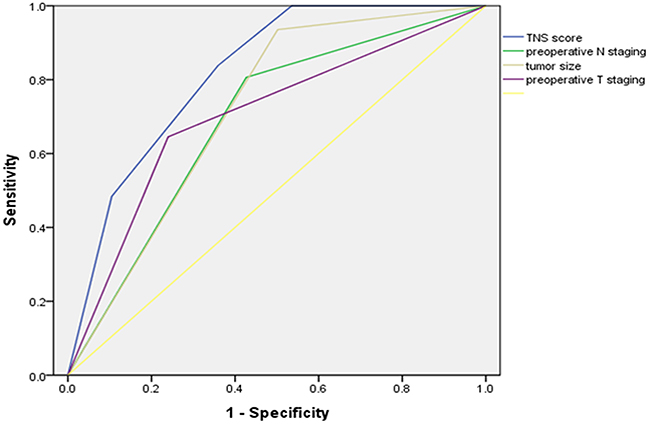 Figure 3: Receiver operating characteristic curves for prediction of TNS score for No. 10 LN metastasis compared with preoperative N staging, tumor size or the preoperative T staging in the development sets.