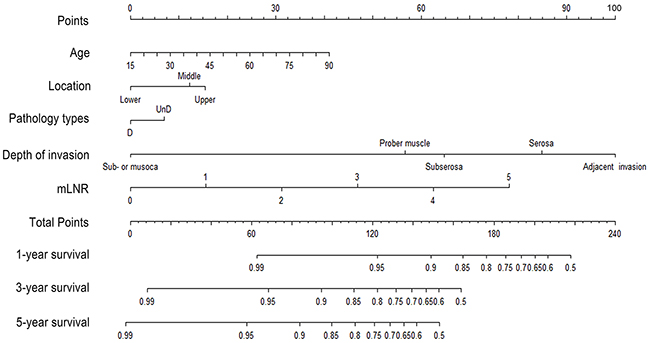 Figure 2: Nomogram predicting 1-year, 3-year and 5-year OS for resectable gastric cancer patients after curative resection. Abbreviation: mLNR: metastatic lymph node ratio.