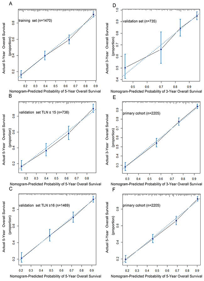 Figure 3: The calibration curves for predicting patients overall survival at 5-year in the training set. (A), validation set with TLN ≤ 15 (B), validation set with TLN ≥ 16 (C), validation set (D) and predicting overall survival at 3-year (E), 5-year (F) in primary cohort. The X-aixs represents the nomogram-predicted survival, and the actual survival is plotted on the Y-axis. The dotted line represents the ideal correlationship between predicted and actual survival.