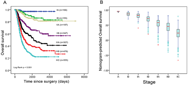 Figure 4: (A) Overall survival of primary cohort according to the 7th edition AJCC staging system; (B) Distribution of nomogram-predicted 5-year overall survival based on the 7th edition of AJCC staging system.