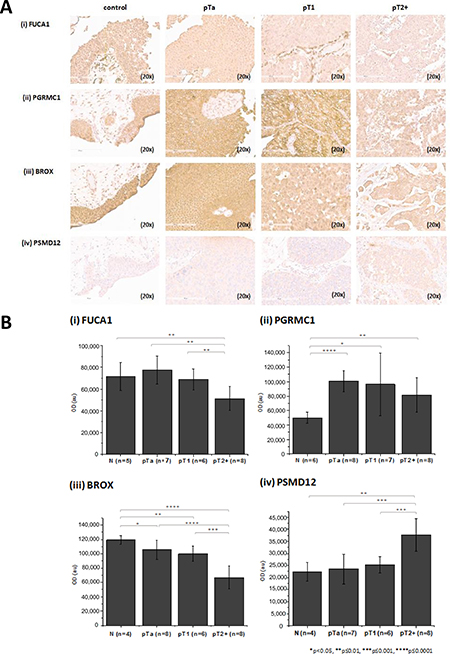 Figure 2: Verification of proteomics findings using immunohistochemistry. (A) Stained sections and (B) quantification results for (i) FUCA 1, (ii) PGRMC1 (iii) BROX and (iv) PSMD12 from control, pTa, pT1 and pT2+ human samples are presented. Immunohistochemistry analysis was performed using tissue microarrays (total n = 30 including 6 controls, 8 pTa, 8 pT1, 8 pT2+). For each protein, the exact number of tissue sections included for the quantification is presented in the figure. Quantification of the staining intensity was performed using the Image J software. Mean staining intensities and standard deviations per analyzed group are presented. Statistical analysis was performed using an independent sample t-test.