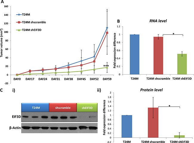 The main objective of this study was the global characterization of the proteomic changes underlying BC invasion that could ultimately lead to a better understanding of disease pathophysiology and subsequent identification of biology-driven therapeutic targets. Towards that end, a comparative proteomic analysis of tissue specimens from NMIBC and MIBC was conducted. In silico analysis of differentially expressed proteins predicted, among others, a significant up-regulation of protein synthesis. By using in vitro assays and in vivo models, the functional relevance of eukaryotic translation initiation factor 3 subunit D (EIF3D) was evaluated in detail.