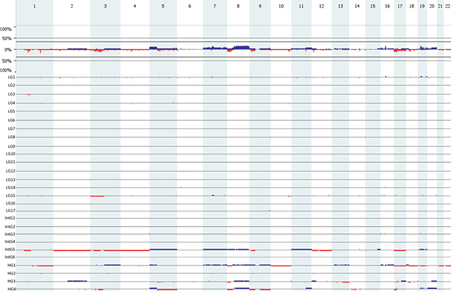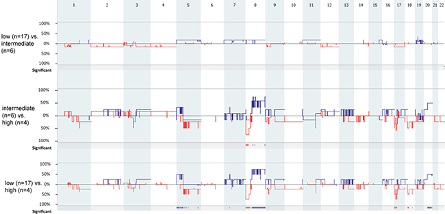 Figure 2: Genome-wide comparison between low (n = 17) vs. intermediate (n = 6), intermediate (n = 6) vs. high (n = 4), and low (n = 17) vs. high (n = 17) grade MEC samples. Gains are portrait in blue and losses are portrait in red. Regions of p < 0.05 are marked by horizontal bars of gains (blue) and losses (red) on the significance track.
