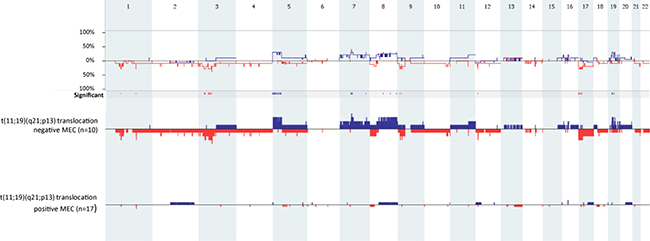 Figure 3: Genome-wide comparison between t(11;19)(q21;p13) translocation-positive (n = 17) and t(11;19)(q21;p13) translocation-negative MEC samples (n = 10). Gains are portrait in blue and losses are portrait in red. Regions of p < 0.05 are marked by horizontal bars of gains (blue) and losses (red) on the significance track.