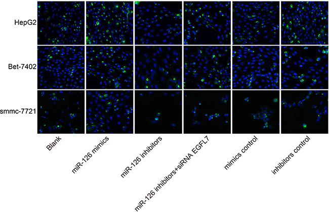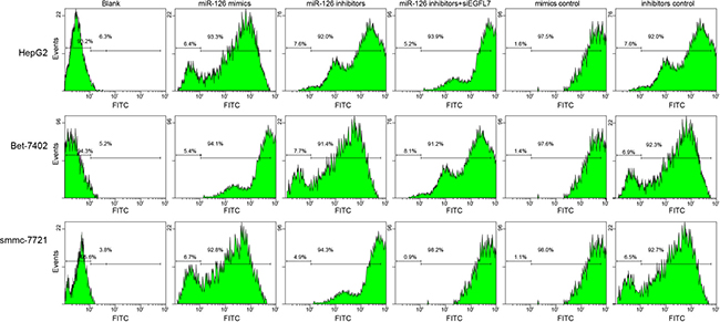 Figure 1: The transfection efficiency of recombinant plasmids pLEGFP-N1-miR-126 mimic, pLEGFP-N1-miR-126 inhibitor, pLEGFP-N1-miR-126 mimic NC, pLEGFP-N1-miR-126 inhibitor NC and pLEGFP-N1-si EGFL7 determined by flow cytometry. A. transfection efficiency of recombinant plasmids in HepG2 cells; B. transfection efficiency of recombinant plasmids in Bet-7402 cells; C. transfection efficiency of recombinant plasmids in smmc-7721 cells; miR-126, microRNA-126; EGFL7, epidermal growth factor-like domain 7; NC, negative control.