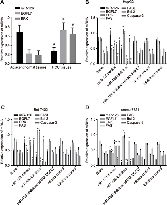 Figure 2: miR-126 expression and EGFL7, ERK, Fas/FasL, Bcl-2, and Caspase-3 mRNA expression in HCC tissues, adjacent normal tissues, and transfected HCC cell lines. (A). comparisons of miR-126 expression and EGFL7 and ERK mRNA expression between the HCC tissues and adjacent normal tissues; (B). comparisons of miR-126 expression and EGFL7, ERK, Fas/FasL, Bcl-2, and Caspase-3 mRNA expressions in HepG2 cells among the six groups; (C). comparison of miR-126 expression and EGFL7, ERK, Fas/FasL, Bcl-2, and Caspase-3 mRNA expressions in Bet-7402 cells among the six groups; (D). comparisons of miR-126 expression and EGFL7, ERK, Fas/FasL, Bcl-2 and Caspase-3 mRNA expressions in smmc-7721 cells among the six groups; #P < 0.05 compared with adjacent normal tissues; *P < 0.05 compared with the blank group; HCC, hepatocellular carcinoma; miR-126, microRNA-126; EGFL7, epidermal growth factor-like domain 7; ERK, extracellular signal-regulated kinase; FASL, FAS ligand; Bcl-2, B cell leukemia/lymphoma-2.