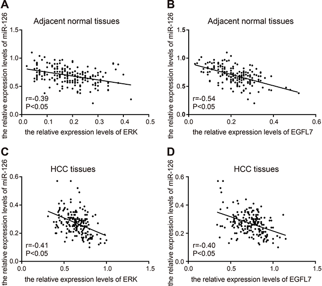 miR-126 expression was negatively correlated with EGFL7 and ERK levels in HCC tissues and cell lines