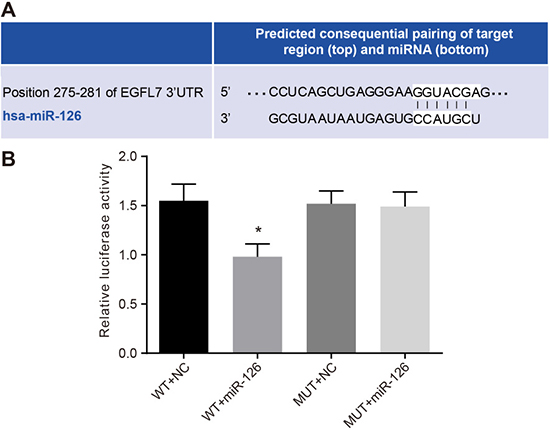 The targeting gene (EGFL7) of miR-126 was predicted using microRNA.org (http://www.microrna.org) and verified by dual-luciferase reporter gene assay. The luciferase activity (Firefly luciferase and Renilla luciferase) was detected according to the manufacturer’s protocol (Promega Corp, Madison, Wisconsin, USA). The medium in the 96-well plate was removed and cells in the medium was lightly washed with 100 μL PBS. After the addition of 100 μL passive lysis buffer (PLB) into each well, cell lysis buffer was collected after gently shaking at room temperature. The cell lysis buffer (20 μL) was mixed with luciferase detection agent II (100 μL), after which the Firefly luciferase activity was obtained using a chemiluminescence detector. Subsequently, the mixture was added with 100 μL of 1 × Stop & Glo Reagent to detect Renilla luciferase activity. Reporter gene expression was expressed as the ratio of Firefly luciferase activity to Renilla luciferase activity.