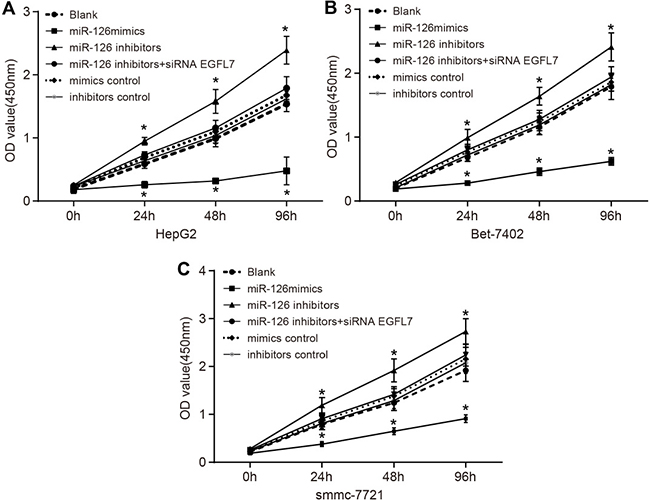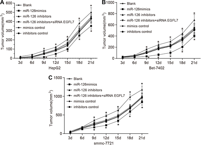Three transfected cell lines (HepG2, Bet-7402 and smmc-7721) were separately divided into the blank group (without transfection), the miR-126 mimics group (transfected with miR-126 mimics plasmid), the miR-126 inhibitors group (transfected with miR-126 inhibitors plasmid), the miR-126 inhibitors + si-EGFL7 group (transfected with miR-126 inhibitors + si-EGFL7 plasmid), the mimics control group (transfected with miR-126 mimics NC plasmid), and the inhibitors control group (transfected with miR-126 inhibitors NC plasmid). Transfected cells were collected and adjusted to a density of 1 × 106/mL. The 12-week-old nude mice were subcutaneously injected with 1 mL of transfected HCC cells (HepG2, Bet-7402, smmc-7721) into the back of the upper limbs to ensure the comparability of results. Rats injected with the same cell line were assigned into six groups (8 mice in each group): the blank group (injection of cells without transfected plasmids); the miR-126 mimics group (injection of cells being transfected with miR-126 mimics plasmid); the miR-126 inhibitors group (injection of cells being transfected with miR-126 inhibitors plasmid); the miR-126 inhibitors + siRNA EGFL7 group (injection of cells being transfected with miR-126 inhibitors + siRNA EGFL7 plasmids); the mimics control group (injection of cells being transfected with miR-126 mimics NC plasmid); and the inhibitors control group (injection of cells being transfected with miR-126 inhibitors NC plasmid). The mice were fed in a specific pathogen-free (SPF) environment after tumor implantation, and the tumor formation in nude mice was observed. The long diameter (a) and short diameter (b) of the tumors were determined every three days. The tumor growth curve was analyzed based on the formula V = 1/2ab2. After 3 weeks, the mice were sacrificed and tumor tissues were isolated from them. The tumor size was calculated, and tumor tissues were preserved in liquid nitrogen for later use.