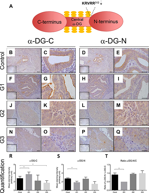 Figure 1: Representative images of immunolocalization of α-DG in the endometrium of post-menopausal women without (control) and with endometrial cancer. Schematic diagram of α-DG protein structure (Figure 1A). Serial sections were stained for α-DG-C and α-DG-N respectively for control (B–E), grade 1 (F–I), grade 2 (J–M), and grade 3 cancer sections (N–Q). The inserts are negative controls. (R) and (S) Mean intensity of glandular epithelial staining for α-DG-C and α-DG-N respectively. (T) The ratio of α-DG-N/α-DG-C. Each bar represents mean ± SD (n = 4–8 for each phase), *p < 0.05.