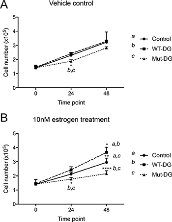DG cell lines were first cultured in 12-well plates (1 × 105 cells per well) for 24 hr in complete media containing 10% csFCS, then changed to fresh complete media containing vehicle control (VC, ethanol only) or 10 nM estrogen (E) (17β-estradiol, Sigma, USA, diluted in ethanol), and cultured for 24 hr or 48 hr. Cells were trypsinized and counted using the Countess (Invitrogen, Carlsbad, CA, USA) to determine cell numbers before and after (24 and 48 hr) the treatment. The entire experiment was repeated independently 4 times (n = 4).