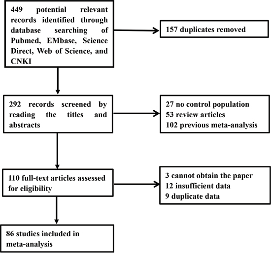 A total of 449 articles were reviewed, and eventually 86 articles with 38,848 cases and 48,928 controls met the inclusion criteria. Among these publications, there was 1 osteosarcoma [23], 1 hepatocellular cancer (HCC) [24], 3 oral cancer [25–27], 5 skin cancer [28–32], 5 colorectal cancer [23, 33–36], 6 head and neck cancer [37–42], 6 esophageal cancer [43–48], 6 non-Hodgkin lymphoma [49–54], 6 prostate cancer [55–60], 8 gastric cancer [61–67], 12 bladder cancer [68–79], 14 lung cancer [70, 80–92], and 15 breast cancer [23, 32, 93–105]. The detailed study selection process is shown in Figure 1. Table 1 presents the major characteristics of the 86 articles.