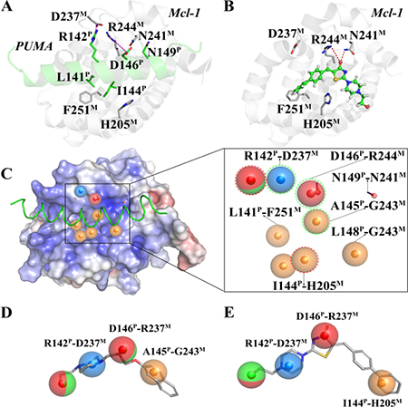 Figure 1: Key interactions at the interfaces of (A) Mcl-1-PUMA and (B) Mcl-1-Comp8 complexes. (C) The structure-based pharmacophore model (Left); The pharmacophore prototype merging (C) and (D) (Right). (D) The best ligand-based pharmacophore model. (E) The final pharmacophore model for prospective virtual screening. Details are present in the Supplementary Information.