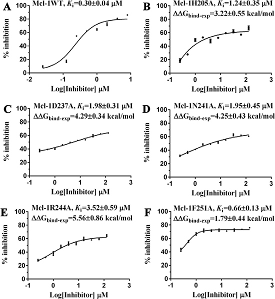 Figure 2: The inhibitory effects of Comp8 on (A) wild and (B–F) mutant types of Mcl-1. Details are present in the Supplementary Information.