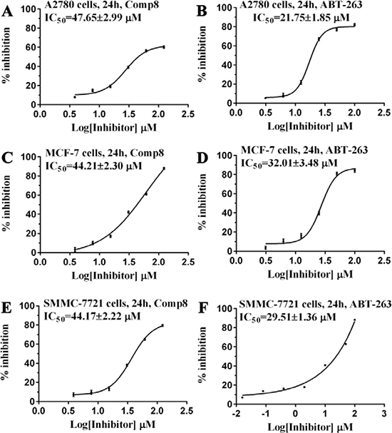 Given the crucial role of R244Mcl-1 in developing Mcl-1 inhibitors [12, 19, 24], we firstly tested the inhibitory effects of these eight compounds on Mcl-1 by FPA competition assay. As shown in Figure 2A, Mcl-1 is significantly deactivated by Comp8 (Ki = 0.30 ± 0.04 μM). The Ki value is comparable with or lower than the counterparts of many other known Mcl-1 inhibitors (like UMI-77, Ki = 0.49 μM) [12, 19, 25, 26]. As for other seven compounds, they shed little effect on inhibiting Mcl-1 (Supplementary Figure 3). In the stable complex (Figure 1B) obtained by docking Comp8 into the binding center of Mcl-1 (Supplementary Figure 4) [27], Comp8 binds within the BH3-binding groove of Mcl-1 and is anchored by two polar contacts formed between the carboxylate group (Comp8) and N241/R244 (Mcl-1). Moreover, van der Waals interactions provided by the residue H205Mcl-1 are pivotal to the stability of Mcl-1-Comp8 complex. The stable occupation of Comp8 in the PUMA-binding groove of Mcl-1 possibly suppresses the Mcl-1-dependent anti-apoptosis of multiple cancer cells. To verify this, Comp8 was tested alongside a known BH3 mimetic ABT-263 for its activity to induce apoptosis in three cancer cell lines (A2780, MCF-7, SMMC-7721). These are well-known cancer cells that depend on Mcl-1 for continuous survival. As shown, on A2780, MCF-7 and SMMC-7721, the inhibitory effect of Comp8 is comparable with the counterpart of ABT-263 (IC50 in the range between 20 to 50 μM, see Figure 3) which is currently under clinical trials in numerous malignancies [28, 29]. Thereafter, flow cytometry detection (FCM) and western blot (WB) analysis of three apoptotic marker proteins (Caspase-3, Cyto-c and Bcl-2) were performed. According to the results of FCM, a substantial increase of apoptotic cells was observed in cancer cells treated with Comp8 (Supplementary Figure 5). WB analysis also revealed similar results (Supplementary Figure 6), the changes of three apotosis indicators fitted well with the characteristics of apoptosis. All the results suggested that Comp8 inhibited cancer cells by promoting apoptosis. The consistency of FPA competition assays and cell tests suggests that Comp8 can be developed as a potential lead compound against cancer through inhibition of Mcl-1.