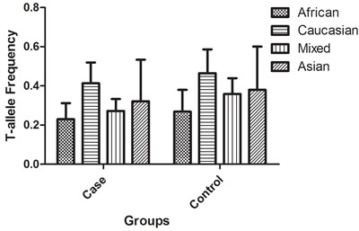 Using various combinations of key terms, 152 article titles were retrieved by a literature search using the PubMed and SinoMed databases. As shown in Figure 1, 66 articles were excluded after screening the abstracts of the manuscripts. The full texts were evaluated, and 47 additional articles were excluded because of the following reasons: duplication (two), meta-analysis (seven), review (twelve), discussion on polymorphism in other diseases (tegumentary leishmaniasis and leprosy) (two), other SNPs in IFNG (one), IFNG receptor gene polymorphisms (fifteen), and other genes (three), and lacked case-control study (five). Finally, 39 different articles [9, 16-53] concerning IFNG +874 T/A (rs2430561) polymorphism and TB susceptibility were included in our meta-analysis (Table 1). Overall, 42 case-control studies with 8,574 cases and 9,011 controls were retrieved based on the search criteria. The controls were mainly healthy populations. First, we checked the Minor Allele Frequency (MAF) reported for the five main worldwide populations in the 1000 Genomes Browser: East Asian, 0.8413; European, 0.5378; African, 0.8327; American, 0.7464; and South Asian, 0.6104. The MAF in our analysis was 0.324 and 0.382 in the case and control group, respectively, both lower than the results in the 1000 Genomes Browser database. Then, the frequency of the T-allele was found to be significantly higher in case individuals of Caucasian ethnicity than in those of African or mixed ethnicities (41.3% vs. 22.9%, P = 0.005, or 41.3% vs. 27.2%, P = 0.017, respectively). A similar trend was found in the control group (Figure 2). Except for seven studies [16, 21, 26, 30, 36, 38, 43], the distribution of genotypes in all the controls was in agreement with Hardy-Weinberg equilibrium (HWE).