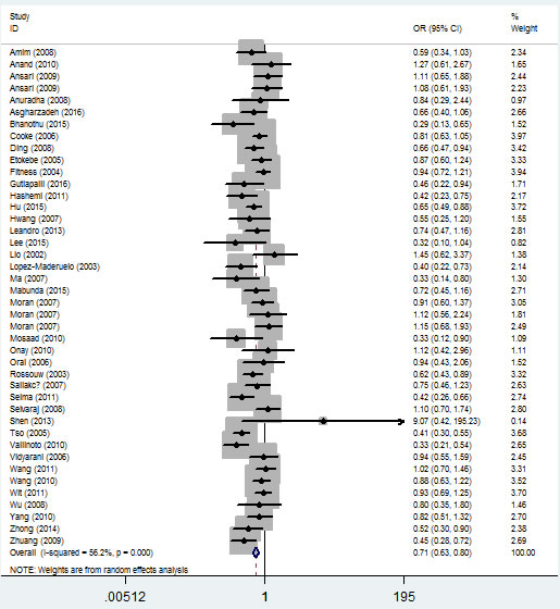 We searched the PubMed and SinoMed (http://www.sinomed.ac.cn/) databases through October 2016, using the keywords “tuberculosis,” “TB,” “polymorphism,” and “IFN-gamma.” One hundred and fifty-two articles were retrieved, 39 of which satisfied our inclusion criteria. We also screened references of the retrieved articles and reviewed all articles via a manual search.