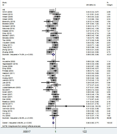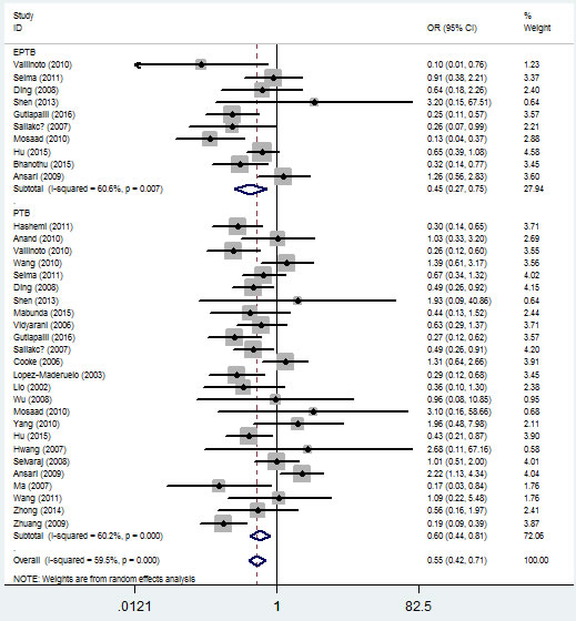 TB, tuberculosis; PB, population-based; HB, hospital-based; MTB, Mycobacterium tuberculosis; IFNG, interferon-γ; Th1, T helper 1; PTB, pulmonary tuberculosis; EPTB, extra-pulmonary tuberculosis; HWE, Hardy-Weinberg equilibrium; MAF, Minor Allele Frequency; GWAS, Genome-wide association studies; NOS, Newcastle-Ottawa Scale; PCR-RFLP, polymerase chain reaction-restriction fragment length polymorphism; PCR-ARMS, polymerase chain reaction-amplification refractory mutation specific; PCR-ASP, polymerase chain reaction-allele specific primers; PCR-SSP, polymerase chain reaction-sequence specific primer; PCR-ASO, polymerase chain reaction-allele-specific oligonucleotide; ARMS-MG/MP-PCR, amplification refractory mutation system-multi gene/multi primer polymerase chain reaction.