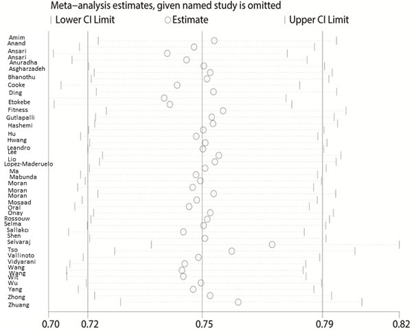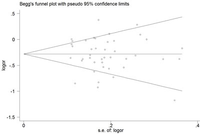 Based on the genotype frequencies for cases and controls, OR with 95% CI were used to measure the strength of the associations between the +874 T/A (rs2430561) single nucleotide polymorphism (SNP) in IFNG and TB risk. The statistical significance of the OR was determined with the Z-test. The heterogeneity assumption among studies was evaluated using a χ2-based Q-test. A P-value of > 0.10 for the Q-test indicated a lack of heterogeneity among studies. If significant heterogeneity was detected, the DerSimonian-Laird random-effects model was used; otherwise, the Mantel-Haenszel fixed-effects model was chosen [61, 62]. We investigated the relationship between IFNG +874 T/A (rs2430561) polymorphism and tuberculosis risk by testing the allelic effect (T vs. A), additive model (TT vs. AA and TA vs. AA), dominant model (T carriers vs. AA), recessive model (TT vs. A carriers), and overdominant model (TA vs. AA + TT). A sensitivity analysis was performed by successively omitting studies to assess the stability of the results. The departure of frequencies of the IFNG +874 T/A (rs2430561) polymorphism from the expected under HWE was assessed by Pearson’s χ2 test, and P < 0.05 was considered significant [63]. Publication bias was assessed by both Egger’s test and Begg’s test, and a P-value < 0.05 was considered significant [64]. All statistical tests for this meta-analysis were performed using the Stata software version 11.0 (StataCorp LP, College Station, TX, USA). The power of our meta-analysis was calculated online using the website http://www.power-analysis.com/.