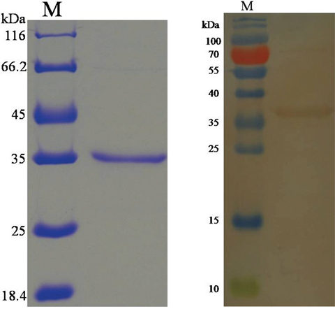 The purified gene sequence that encodes a HCcyst-2 protein, was successfully inserted into the bacterial expression vector pET32a, and confirmed by sequence the sequence ligation into correct reading frame. The expressed recombinant protein was detected as a double His 6 tagged fusion protein with a predicted molecular mass of 34 kDa (Figure 2A). Then the rHCcyst-2 protein expressed in a soluble form was purified by affinity chromatography with His·Bind®128 Resin Chromatography kit (Novagen) as per manufacturer’s protocol. The purified protein product of rHCcyst-2 was resolved on SDS-PAGE with estimated purity more than 95 %.