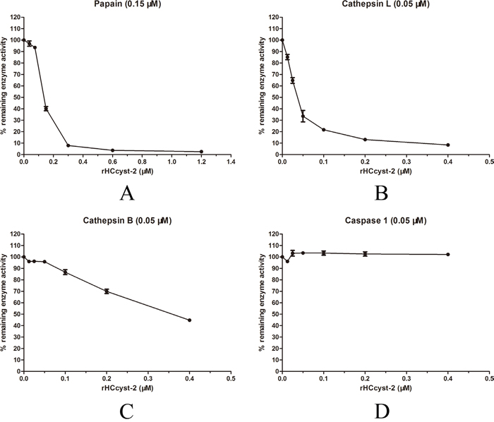The inhibitory effect of HCcyst-2 for its overlapping target enzymes was investigated by using purified recombinant cystatin against papain-like cysteine proteases and caspase 1 as another family protease to verify the target specificity of HCcyst-2. Our results highlighted that rHCcyst-2 could efficiently halt papain and cathepsin L activity, whereas rHCcyst-2 showed a lesser effective role on the inhibitory activity of cathepsin B and no inhibitory action with caspase 1 (Figure 4 and Table 1).