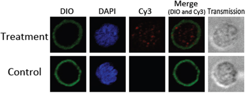 Goat monocytes were incubated with rHCcyst-2 and the protein uptake by monocytes was investigated by an immunofluorescence approach. As depicted in Figure 5, the emission from the Cy3-labeled rHCcyst-2 was red, the DAPI-labeled nuclei were blue and DiO-labeled cell membrane was green. No fluorescence was observed under any color channel in the unstained background control. In the control group, no red fluorescence was observed (Figure 5 lower panel). Intense red fluorescence was observed when the cells were incubated with rHCcyst-2 (Figure 5 upper panel).