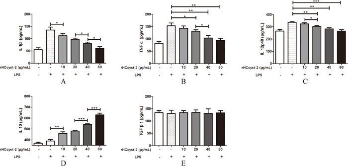 The ELISA method was used to detect the cytokines expression level in goat monocytes. Our results showed that rHCcyst-2 decreased the LPS induced production of TNF-α, IL-1β and IL-12p40 whereas, rHCcyst-2 significantly augmented the IL-10 production in goat monocytes at dose-dependent manner compared to the LPS treated only (Figure 6). No significantly difference was observed in the secretion of TGF-β1 at different groups.
