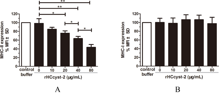 The purified monocytes (0.5×106 cells/ml) were incubated with different concentrations of rHCcyst-2 or equal volumes of control buffer for 24 h in complete RPMI 1640 at 37 °C. Cells were then stained with the monoclonal antibodies to MHC-I (MCA2189A647, AbDserotec, BioRad Laboratories, CA, USA) and MHC-II (MCA2226F, AbDserotec), and analyzed on a FACS Calibur cytometer (BD Biosciences, San Jose, CA, USA). Results were expressed as the percentage of mean fluorescence intensity (MFI) of control.