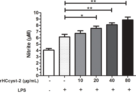 The nitrate concentration of the culture supernatant was significantly increased by serial concentrations of rHCcyst-2 protein. Our results suggested that rHCcyst-2 could up-regulate the LPS induced NO production of goat monocytes (Figure 8).