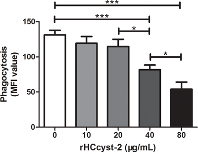 Figure 9: rHCcyst-2 decrease phagocytic capacity of goat monocytes. Monocytes were collected after treated with rHCcyst-2 for 48 h and incubated with FITC-dextran (1 mg/ml in RPMI1640) for 1 h at 37 °C. The FITC-dextran internalization of cells was analyzed by flowcytometry and calculated as mean fluorescence intensity (MFI). The data are representative of three independent experiments (*p < 0.05, **p < 0.01, ***p < 0.001).