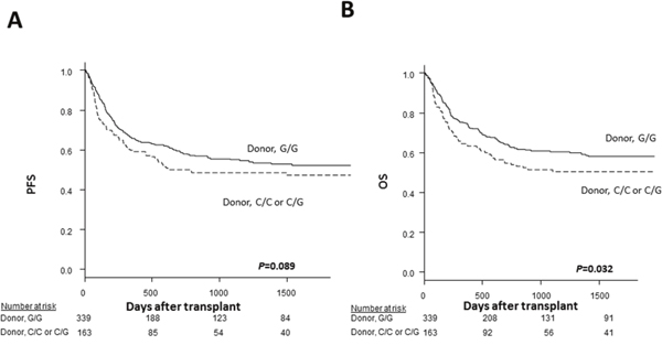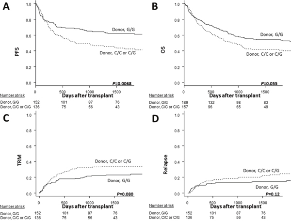 Figure 4: The Kaplan-Meier analysis of the progression-free survival rates (A) and the overall survival rates (B) after transplantation according to the donor TLR4 genotype in the validation cohort. The solid lines represent the donor G/G genotype, and the dashed lines represent the donor C/C or C/G genotype.