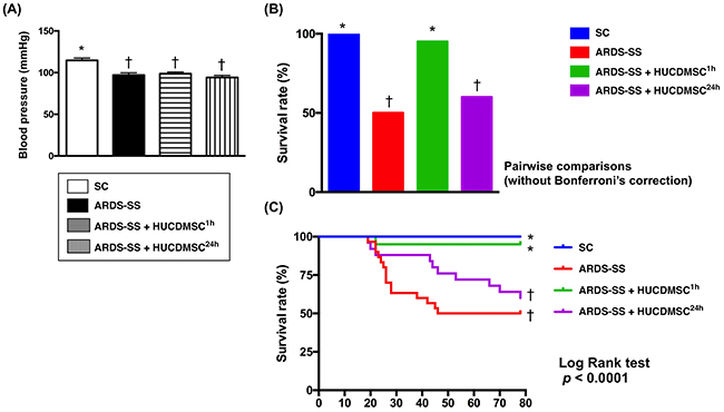 Figure 2: Systolic blood pressure (SBP) at 28 h after sepsis induction and mortality rate by day 5 after ARDS-SS induction. (A) SBP was measured from rat tail at 28 h after sepsis syndrome induction, * vs. †, p<0.001. (B) The result of Pair comparisons (i.e., expressed as bar charts) showed that the 5-day survival rate was higher in sham control and ARDS-SS + HUCDMSC1h than in ARDS-SS + HUCDMSC24h. † vs. ‡, p<0.0003. (C) Kaplan Meier curve showed 5-day cumulative survival rate among the four groups. * vs. other groups with different symbols (†, ‡), p<0.0001 (for 4 groups by log rank test). Symbols (*, †, ‡) indicate significance at the 0.05 level. SC = sham control; ARDS = acute respiratory distress syndrome; SS = sepsis syndrome; HUCDMSC = human umbilical cord-derived mesenchymal stem cell; 1h indicated HUCDMSC administration at 1 hour after SS induction; 24h indicated HUCDMSC administration at 24 hour after SS induction.