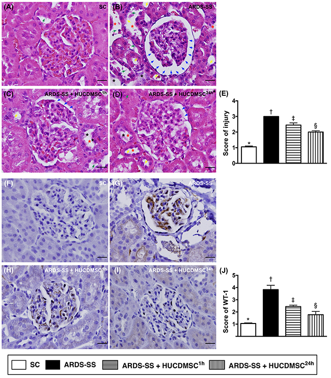 Figure 3: Histopathological findings of rat kidney injury and cellular expression of WT-1 by day 5 after ARDS-SS induction. (A to D) Light microscopic findings of H & E stain (400x), demonstrating higher degree of loss of brush border in renal tubules (yellow arrows), tubular necrosis (green arrows), tubular dilation (red asterisk), protein cast formation (black asterisk), and dilation of Bowman’s capsule (blue arrows) in ARDS-SS group than in other groups. (E) * vs. other groups with different symbols (†, ‡, §), p<0.0001. (F to I) Illustrating the microscopic finding (400x) of immunohistochemical staining for identification of Wilm's tumor suppressor gene 1 (WT-1), expressed predominantly in podocytes (gray color). (J) Analytical results of WT-1 expression, * vs. other groups with different symbols (†, ‡, §), p<0.0001. Scale bars: 20 μm. All statistical analyses were performed by one-way ANOVA, followed by Bonferroni multiple comparison post hoc test (n=8 for each group). Symbols (*, †, ‡, §) indicate significance at 0.05 level. SC = sham control; ARDS = acute respiratory distress syndrome; SS = sepsis syndrome; HUCDMSC = human umbilical cord-derived mesenchymal stem cell; 1h indicated HUCDMSC administration at 1 hour after SS induction; 24h indicated HUCDMSC administration at 24 hour after SS induction.