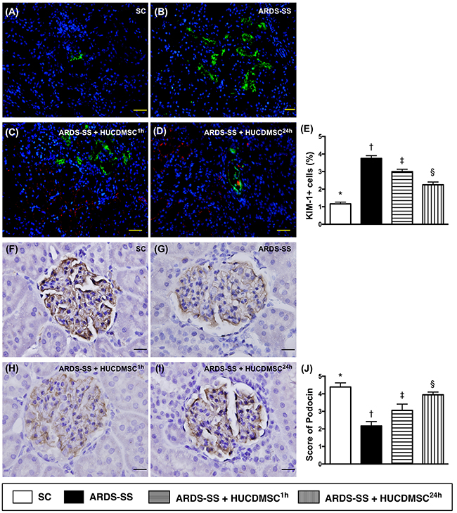 Figure 5: Microscopy of kidney injury biomarker and podocyte component in kidney parenchyma by day 5 after ARDS-SS induction. (A to D) Immunofluorescent (IF) staining (400x) of kidney injury molecule (KIM)-1+ cells (green color). Nuclei were stained by DAPI (blue color). Red color in (C) and (D) indicated HUCDMSCs were found in kidney parenchyma. (E) Analytical result of number of KIM-1+ cells among the four groups * vs. other groups with different symbols (†, ‡, §), p<0.0001. (F to I) Immunohistochemical (IHC) microscopy (400x) for identification of cellular expression of podocin (gray color). (J) Analytical result of number of KIM-1+ cells among the four groups * vs. other groups with different symbols (†, ‡, §), p<0.0001. Scale bars: 20 μm. All statistical analyses were performed by one-way ANOVA, followed by Bonferroni multiple comparison post hoc test (n=8 for each group). Symbols (*, †, ‡, §) indicate significance at 0.05 level. SC = sham control; ARDS = acute respiratory distress syndrome; SS = sepsis syndrome; HUCDMSC = human umbilical cord-derived mesenchymal stem cell; 1h indicated HUCDMSC administration at 1 hour after SS induction; 24h indicated HUCDMSC administration at 24 hour after SS induction.