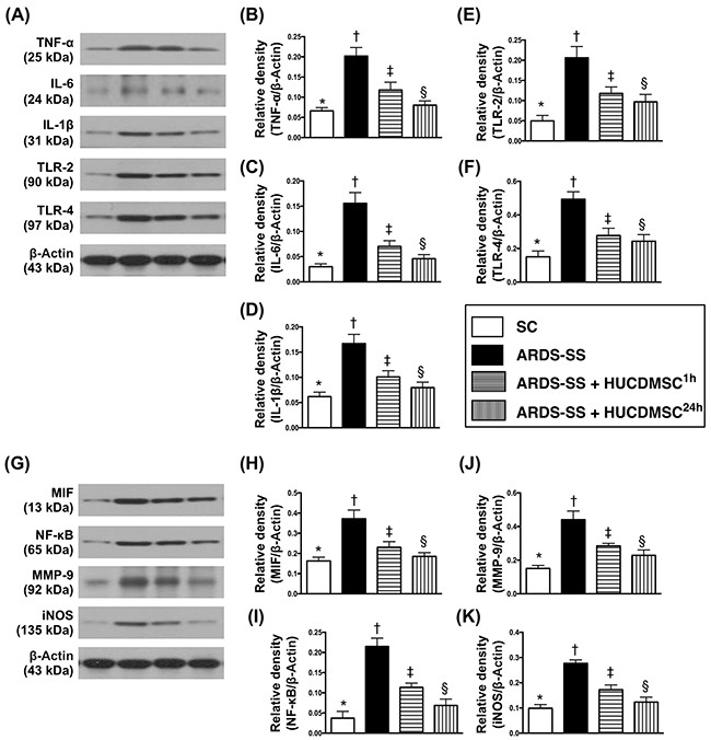 Figure 6: Protein expression of inflammatory biomarkers in kidney parenchyma by day 5 after ARDS-SS induction. (A) Illustration of grouping of the protein expressions (Part I) with same actin as internal control. (B) Protein expression of tumor necrosis factor (TNF)-α, * vs. other groups with different symbols (†, ‡, §), p<0.0001. (C) Protein expression of interleukin (IL)-6, * vs. other groups with different symbols (†, ‡, §), p<0.0001. (D) Protein expression of IL-1ß, * vs. other groups with different symbols (†, ‡, §), p<0.001. (E) Protein expression of tall-like receptor (TLR)-2, * vs. other groups with different symbols (†, ‡, §), p<0.0001. (F) Protein expression of TLR-4, * vs. other groups with different symbols (†, ‡, §), p<0.0001. (G) Illustrating grouping of the protein expressions (Part II) with same actin as internal control. (H) Protein expression of macrophage migratory inhibitor factor (MIF), * vs. other groups with different symbols (†, ‡, §), p<0.001. (I) Protein expression of nuclear factor (NF)-κB, * vs. other groups with different symbols (†, ‡, §), p<0.0001. (J) Protein expression of matrix metalloproteinase (MMP)-9, * vs. other groups with different symbols (†, ‡, §), p<0.001. (K) Protein expression of inducible nitric oxide synthase (iNOS), * vs. other groups with different symbols (†, ‡, §), p<0.001. All statistical analyses were performed by one-way ANOVA, followed by Bonferroni multiple comparison post hoc test (n=8 for each group). Symbols (*, †, ‡, §) indicate significance at 0.05 level. SC = sham control; ARDS = acute respiratory distress syndrome; SS = sepsis syndrome; HUCDMSC = human umbilical cord-derived mesenchymal stem cell; 1h indicated HUCDMSC administration at 1 hour after SS induction; 24h indicated HUCDMSC administration at 24 hour after SS induction.