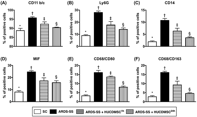 Figure 8: Flow cytometry analysis of inflammatory biomarkers in ascites by day 5 after ARDS-SS induction. (A) Flow cytometry analysis of CD11b/c+ cells in ascites, * vs. other groups with different symbols (†, ‡, §), p<0.001. (B) Flow cytometry analysis of Ly6G+ cells in ascites, * vs. other groups with different symbols (†, ‡, §), p<0.0001. (C) Flow cytometry analysis of CD14+ cells in ascites, * vs. other groups with different symbols (†, ‡, §), p<0.0001. (D) Flow cytometry analysis of macrophage migratory inhibitor (MIF)+ cells in ascites, * vs. other groups with different symbols (†, ‡, §), p<0.0001. (E) Flow cytometry analysis of CD68/CD80+ cells in ascites, * vs. other groups with different symbols (†, ‡, §), p<0.0001. (F) Flow cytometry analysis of number of CD68/CD163+ cells in ascites, * vs. other groups with different symbols (†, ‡, §), p<0.001. All statistical analyses were performed by one-way ANOVA, followed by Bonferroni multiple comparison post hoc test (n=8 for each group). Symbols (*, †, ‡, §) indicate significance at 0.05 leve). SC = sham control; ARDS = acute respiratory distress syndrome; SS = sepsis syndrome; HUCDMSC = human umbilical cord-derived mesenchymal stem cell; 1h indicated HUCDMSC administration at 1 hour after SS induction; 24h indicated HUCDMSC administration at 24 hour after SS induction.