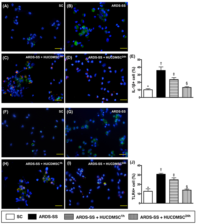Figure 11: Cellular expression of IL-1ß+ and TLR+4 cells in ascites by day 5 after ARDS-SS induction. (A to D) Immunofluorescent (IF) image (400x) of interleukin (IL)-1ß+ cells in ascites (green color). Nuclei were stained by DAPI (blue color). Red color in (C) and (D) indicated HUCDMSCs were found in kidney parenchyma. (E) Analytical result of number of IL-1ß+ cells among the four groups, * vs. other groups with different symbols (†, ‡, §), p<0.0001. (F to I) IF (400x) of tall-like receptor (TLR)-4+ cells in ascites (green color). Nuclei were stained by DAPI (blue color). Red color in (H) and (I) indicated HUCDMSCs were found in kidney parenchyma. (J) Analytical result of TLR-4+ cells among the four groups, * vs. other groups with different symbols (†, ‡, §), p<0.0001. Scale bars: 20 μm. All statistical analyses were performed by one-way ANOVA, followed by Bonferroni multiple comparison post hoc test (n=8 for each group). Symbols (*, †, ‡, §) indicate significance at 0.05 level. SC = sham control; ARDS = acute respiratory distress syndrome; SS = sepsis syndrome; HUCDMSC = human umbilical cord-derived mesenchymal stem cell; 1h indicated HUCDMSC administration at 1 hour after SS induction; 24h indicated HUCDMSC administration at 24 hour after SS induction.