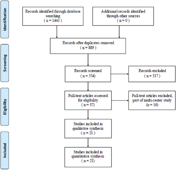 The search yielded 1443 journal articles, all duplicate articles were removed. 554 potentially eligible studies subjected to further screening. By reading the title and abstract, 517 studies did not meet our selection criteria. After review of the full text, 16 articles were ruled out. Finally, 21 studies were included with a total of 4447 individuals in the analysis (Figure 1).