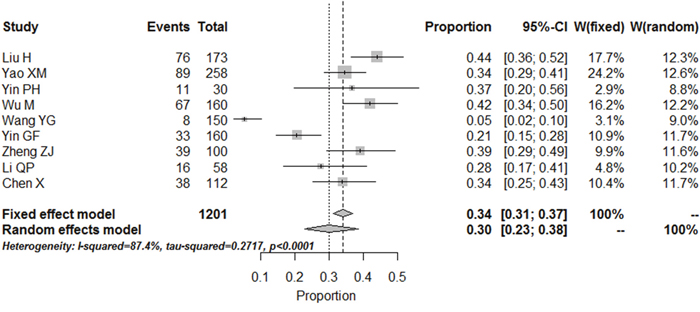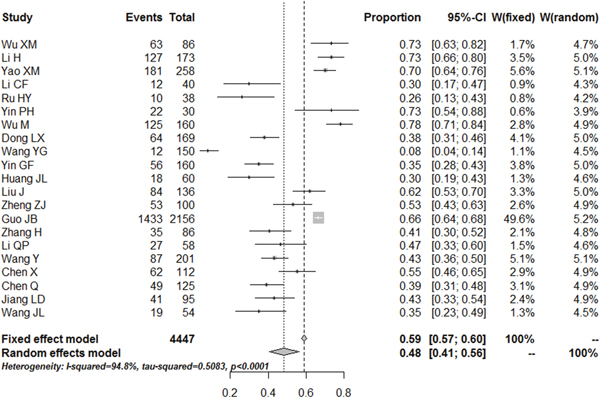 Figure 2: Meta-analysis of the prevalence rates for depression in RA patients in China.